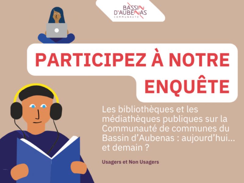 Dans le cadre de sa démarche de réflexion autour de la mise en réseau, la Communauté de Communes du Bassin d’Aubenas (CCBA) réalise une enquête sur l’offre de lecture publique et sur l’accès aux 19 bibliothèques/médiathèques et à la Médiathèque Intercommunale de son territoire.